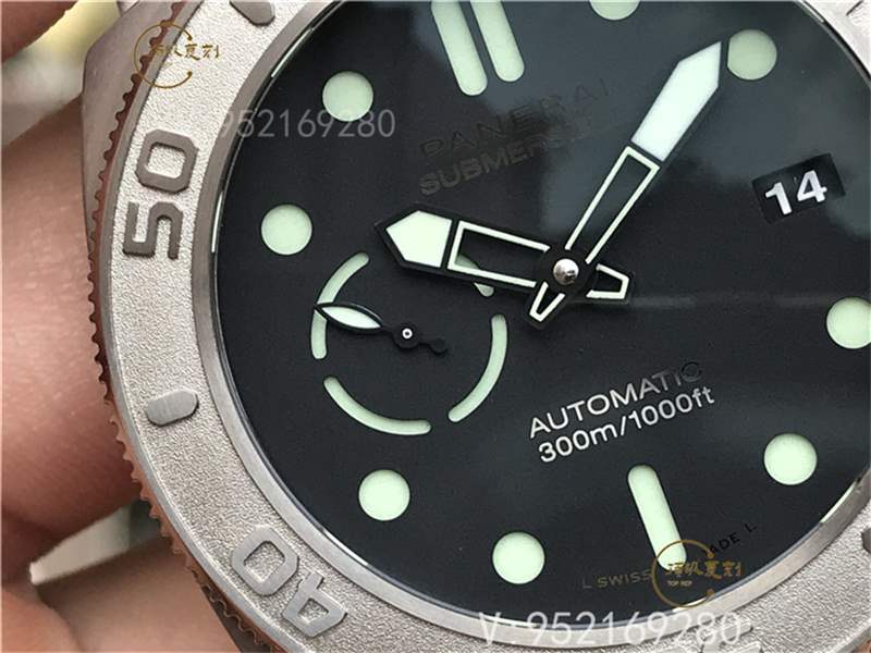 VS廠的沛納海984圈口同正品,都是立體數(shù)字結構。采用Eco-Titanium?材質(zhì),逆時針旋轉(zhuǎn)表圈附分度標,分度標志立體美觀,外表采用拉絲工藝,看起來非常平整,外圈凹槽內(nèi)磨砂效果,為整只手表增添一種古樸的藝術感。借助其單向旋轉(zhuǎn)表圈,佩戴者可以放心地計算下潛時間,而涂覆在時標和大號鏤空指針上的Super-LumiNova?超級夜光涂層則確保腕表在漆黑的環(huán)境中依然可以清晰辨讀。