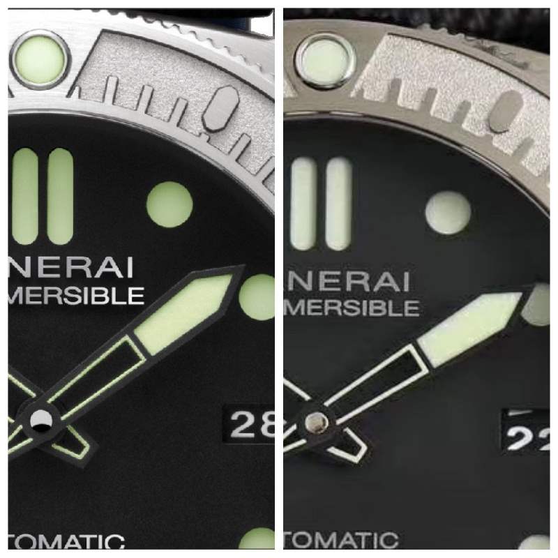 因為這款表實在是難辨真假,筆者無奈,只能放大給大家看了,因為光線不同,所以看起來盤面刻度夜光粉顏色不同,這是因為光線導致的,其實兩者夜光刻度顏色一致。最大的不同在于日歷窗口,VS廠沛納海984日歷開窗打了一點。其他的差異非常細微,三明治表盤開孔大小以及邊緣整理都非常整潔,夜光都是雙色夜光,且明亮。