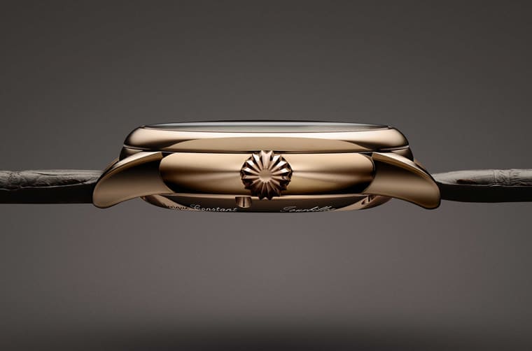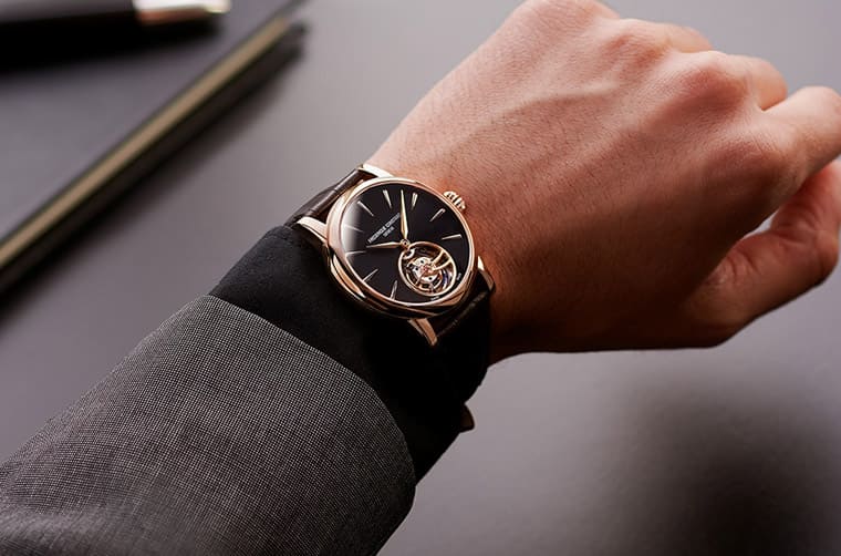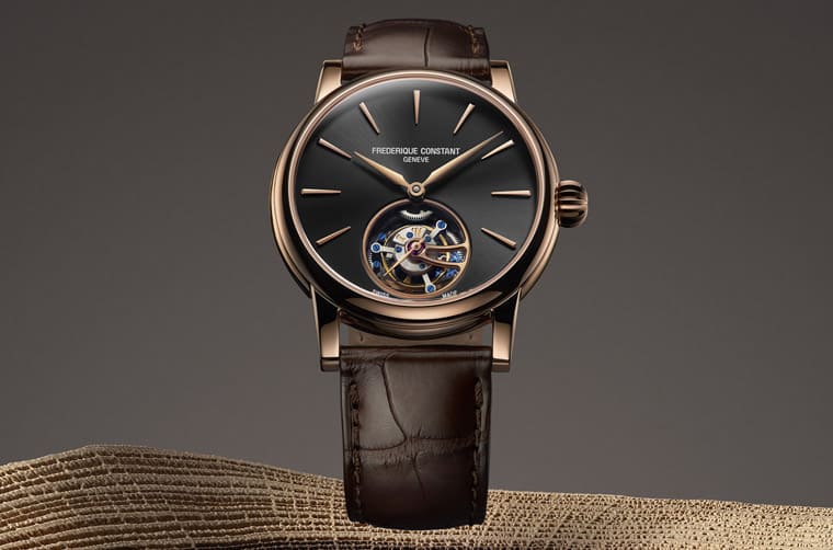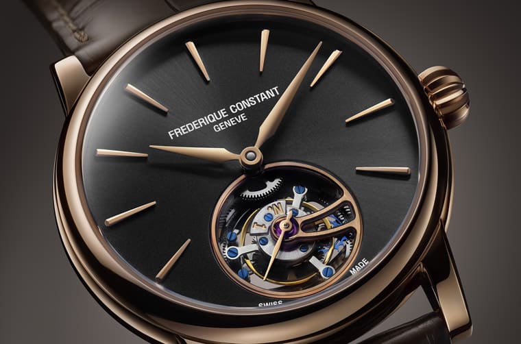 表款搭配棕色鱷魚皮表帶以及黑色面盤烘托玫瑰金材質的貴氣,包括指針與時標等也同為玫瑰金色,黑色面盤以太陽放射紋處理可以反射出多變的光芒,而這次乍見手表的陀飛輪裝置時,會讓人感到手表似乎變俐落了,之所以會有一種驚喜感是因為過去搭載FC-980機芯的陀飛輪手表,其陀飛輪框架會固定在一枚延伸至面盤的橋板上,使得面盤右下角額外多出一塊銀色的機芯零件,其與陀飛輪的圓形框架剛好組成一個類似逗號的造型,看起來格外有特色。