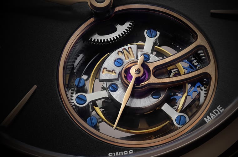 ▲陀飛輪裝置的軸心裝上一枚玫瑰金色指針,配合陀飛輪一分鐘自轉一圈的周期,恰好作為小秒顯示之用。