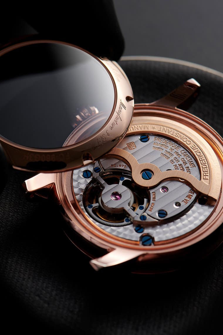 ▲透背設計露出品牌自制的FC-980機芯,其達到陀飛輪復雜等級,機芯零件的作工也遵循高級制表傳統。