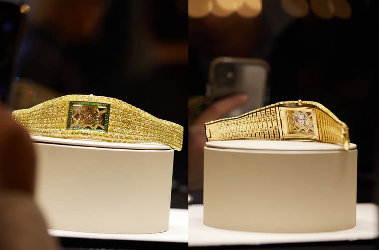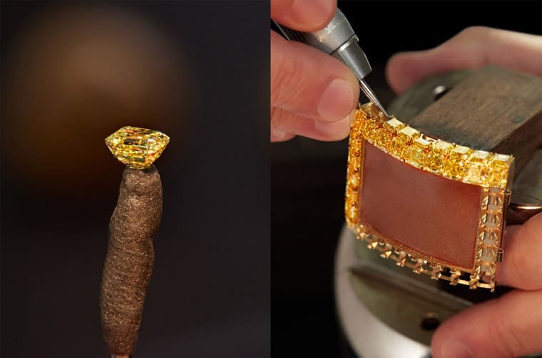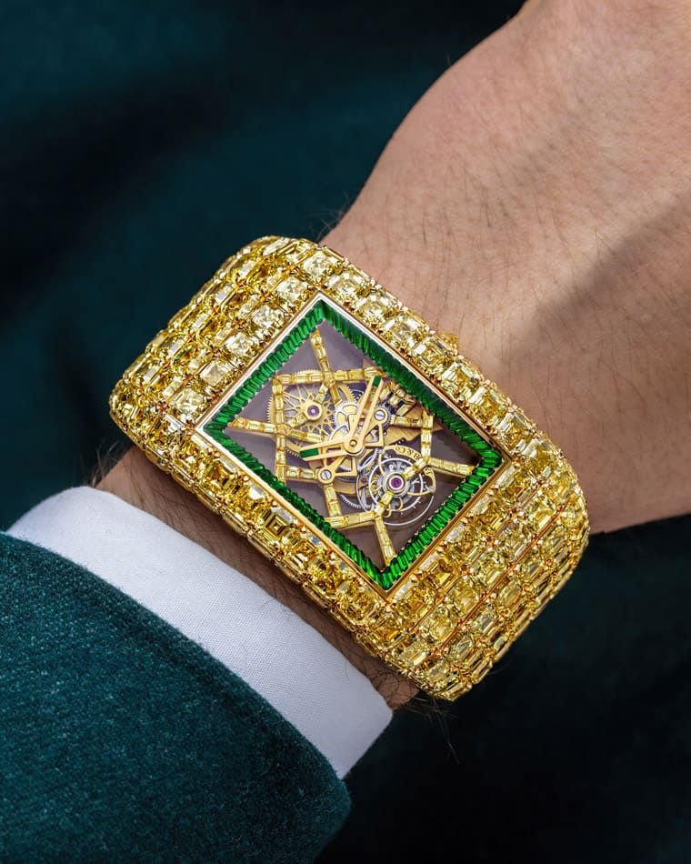 ▲品牌花費好幾年的時間收集制表需要用到的黃色鉆石,最終將其切割出400多顆,約重217克拉,全數鑲在手表的表殼、鏈帶與面盤上。