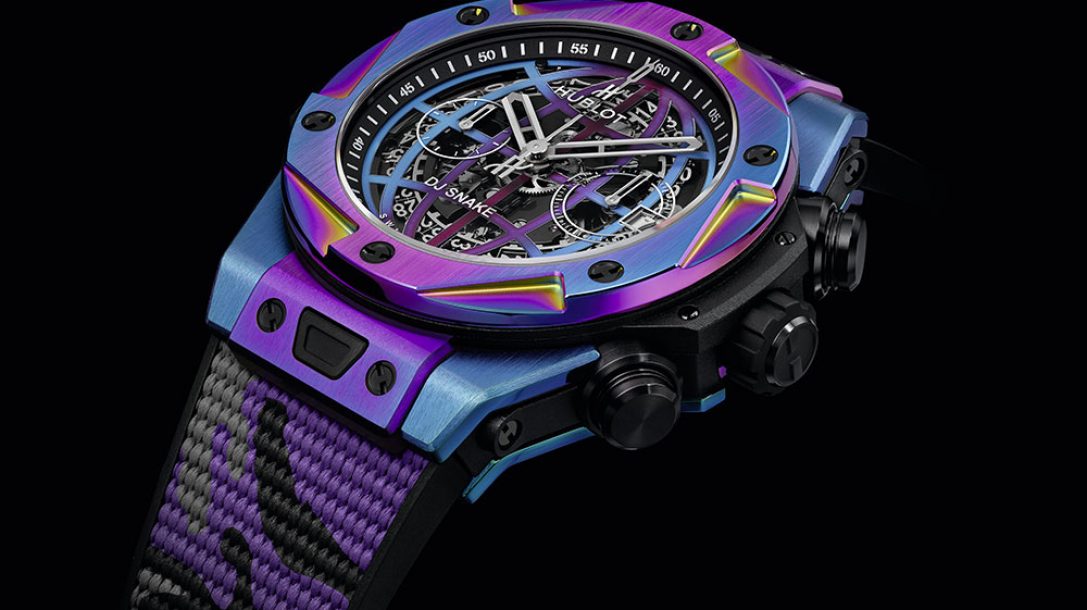 宇舶表和DJ Snake自2018年1月1日起成為合作伙伴,當時他在俄羅斯FIFA世界杯期間主持宇舶表閉幕晚會的甲板。三年后,這一合作伙伴關系的第一款手表亮相:The Big Bang DJ Snake。大爆炸的標志性設計現在具有彩虹般的光澤,具有無數的藍色和紫色色調。45毫米表殼的表圈和六顆鈦金屬組件均采用特殊技術制造工藝處理,類似于黑色PVD處理。在此過程中,當腕表的不同組件涂有不同顏色時,必須分別放置在特定位置。結果是一種光學效果,其中手表的顏色根據光線和從不同角度觀看時而變化。不僅如此,在虹彩處理之前,零件的表面也硬化了,以提高其附著力。這是一項復雜的操作,因為在生產的100枚腕表中,很難獲得相同的顏色漸變。表圈外緣的切口由DJ Snake親自設計。這些缺口使Big Bang DJ Snake立即被識別出來,將其與其他系列區分開來?!叭诤纤囆g”哲學的例證,宇舶表如此珍視!
