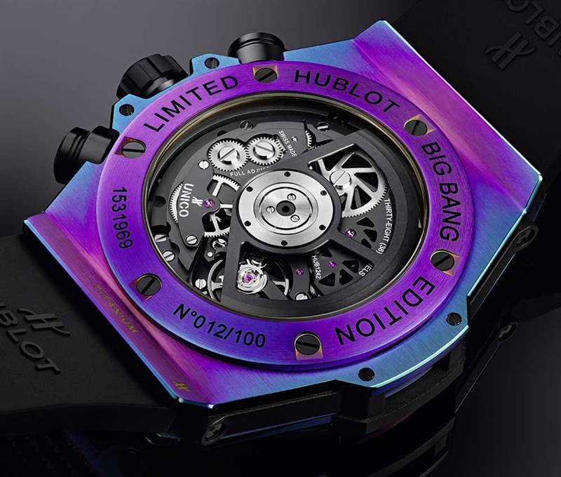 這款半透明外觀讓您一睹著名的HUB1242 UNICO機芯,這是一款動力儲存為72小時的飛返計時碼表。